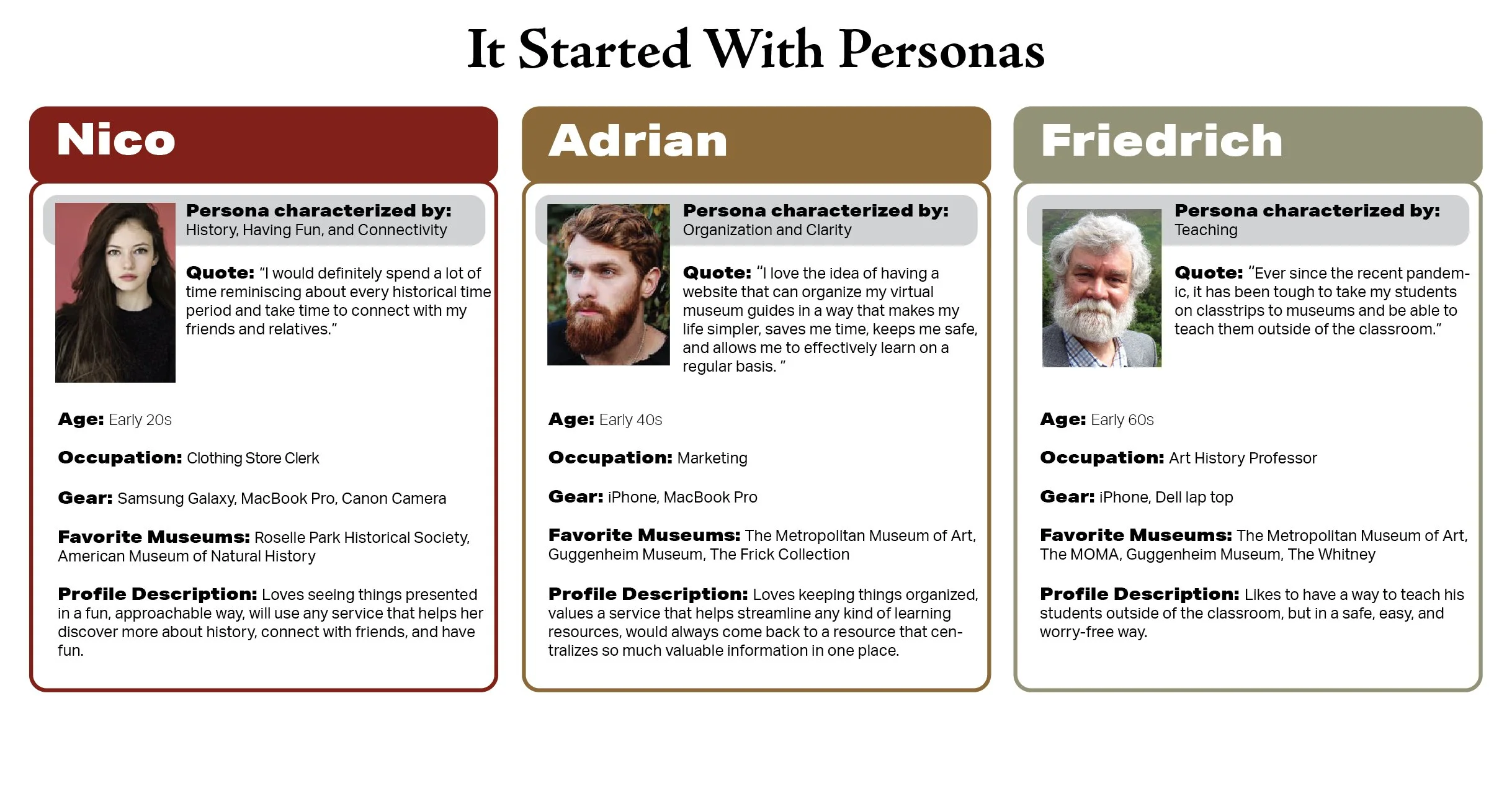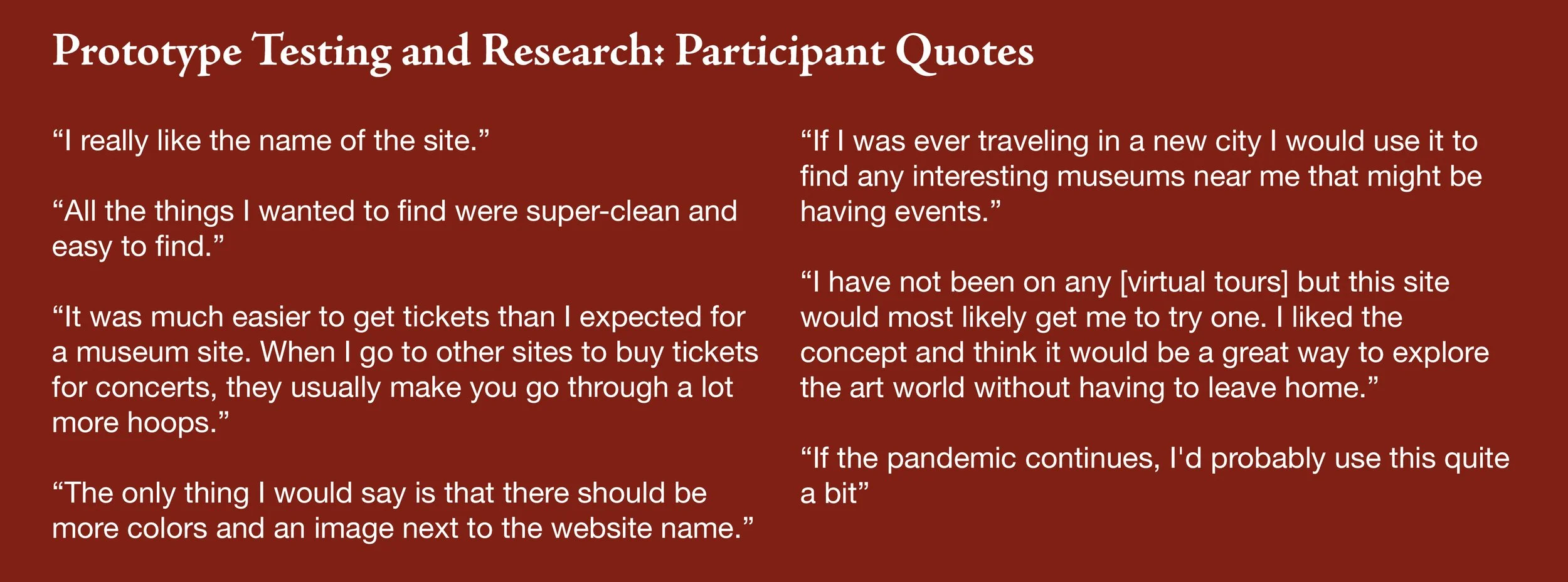This website is essentially for anyone who wants to visit museums from the comfort of their own home. Through this site, users can not only virtually visit all of their favorite museums, but easily discover many new ones; many they would maybe otherwise never have access to. The complexities and burdens of traveling far distances are completely eliminated.