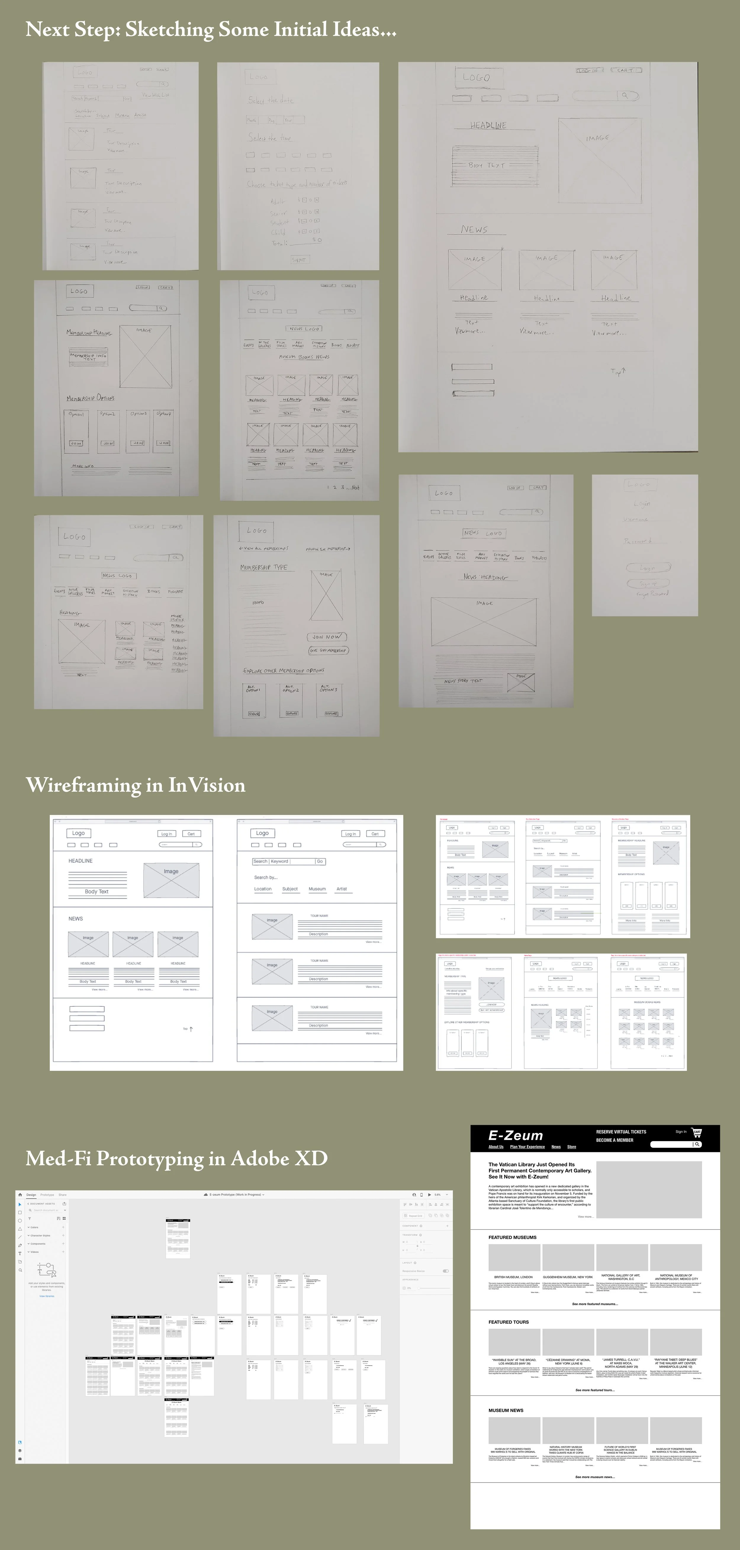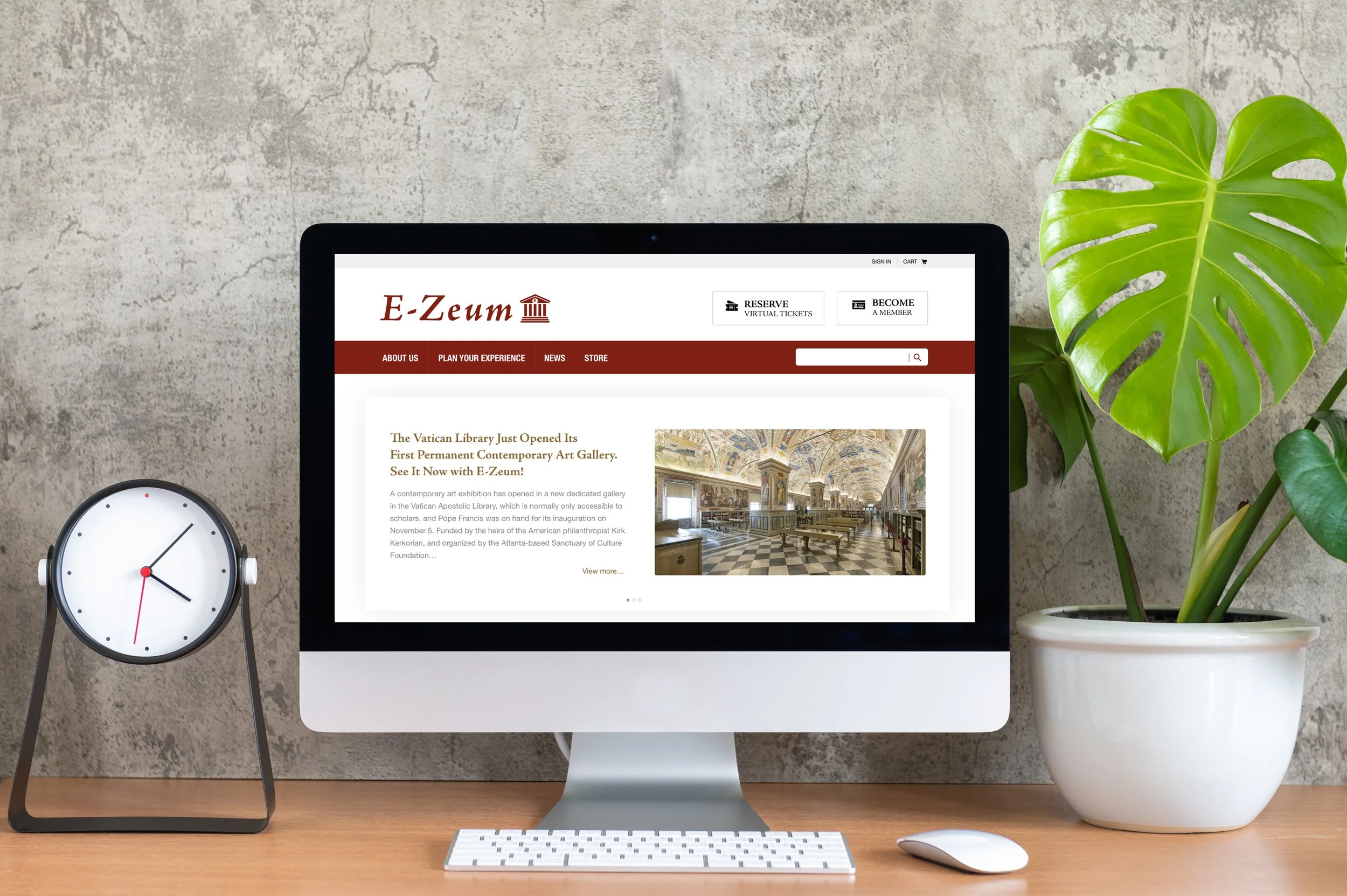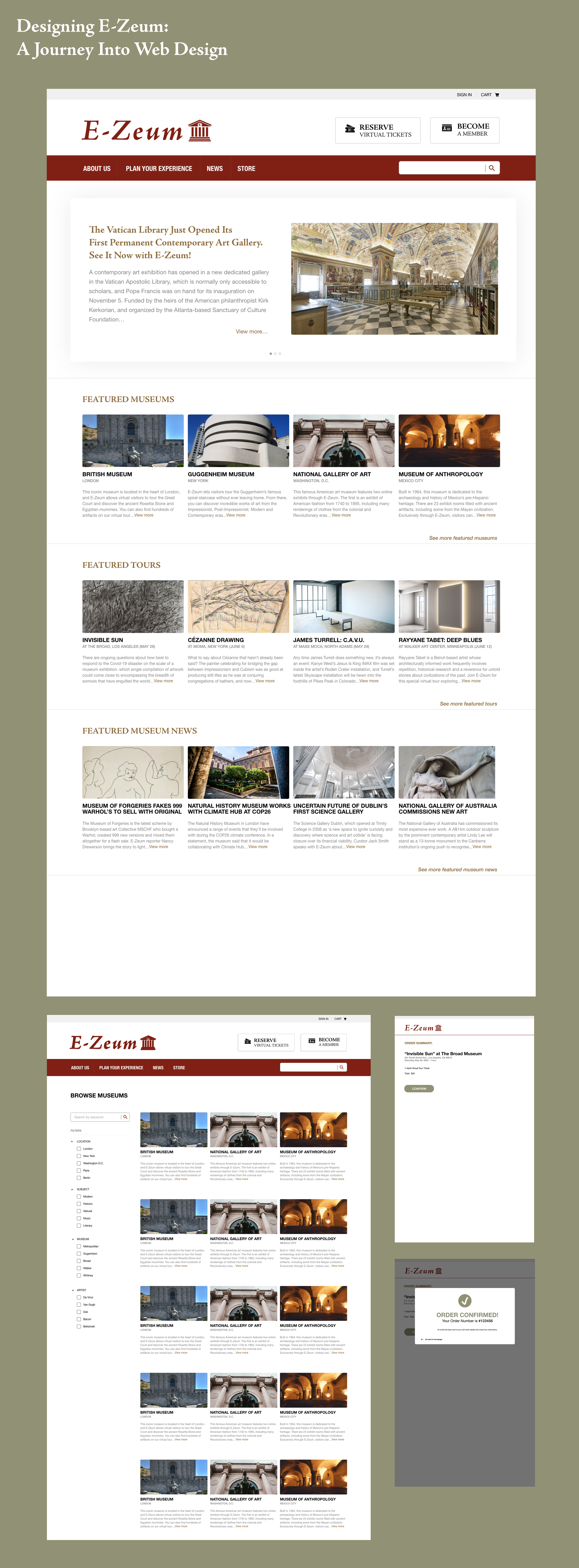 I conceived of E-Zeum as a desk-top website that allows its visitors to virtually attend museum tours from all over the world, all offered in one centralized location. Any museum can sign up and have their tour guides give their tours through the site, and users can search and sign up for whichever tour or tour times they would like. Anyone attending the virtual tours can ask questions about the exhibits, too, because the tours include live tour guides.